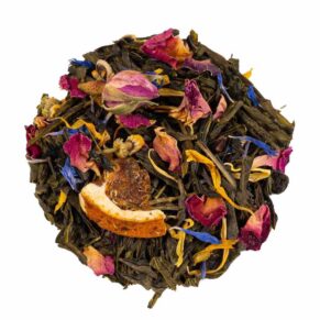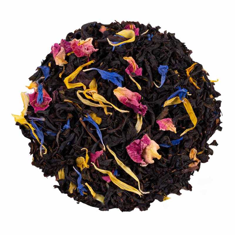 Najwyższej jakości czarna herbata Ceylon (płd. Indie, Chiny) o lekkim charakterze łączy się z nutami świeżości mango, aksamitki i delikatnym aromatem płatków róży i bławatka.
